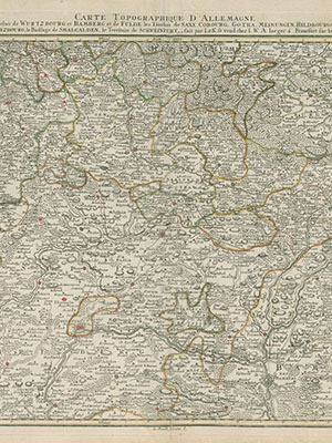 Contenant la Franconie scavoir und parte des evêchés de Wurzbourg, de Bamberg, d'Eichstadt et d'Elwang, le marcgraviat de Brandenbourg-Culmbach et d'Anspach, les principautés de Schwarzenberg, de Hohenlohe, d'Oettingen, les comtés de Limpurg et de Castel, le territoire des libres villes ... Nuremberg, Rothenbourg et Halle en Suabe