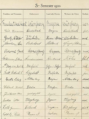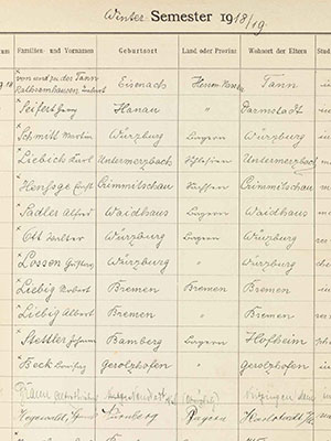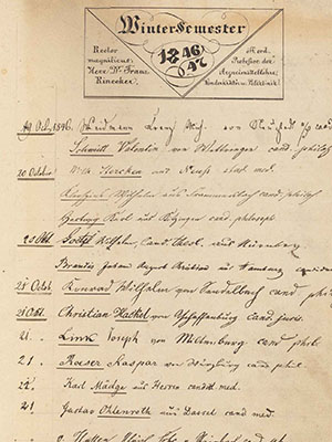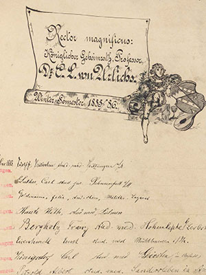 In addition to the digitized course catalogues for the years 1785-1945, the University Library of Würzburg holds further materials documenting the university’s history. A selection of these items has been brought together in this compilation and is made available here for digital access and reuse.Course catalogues 1785-1945 ↗
